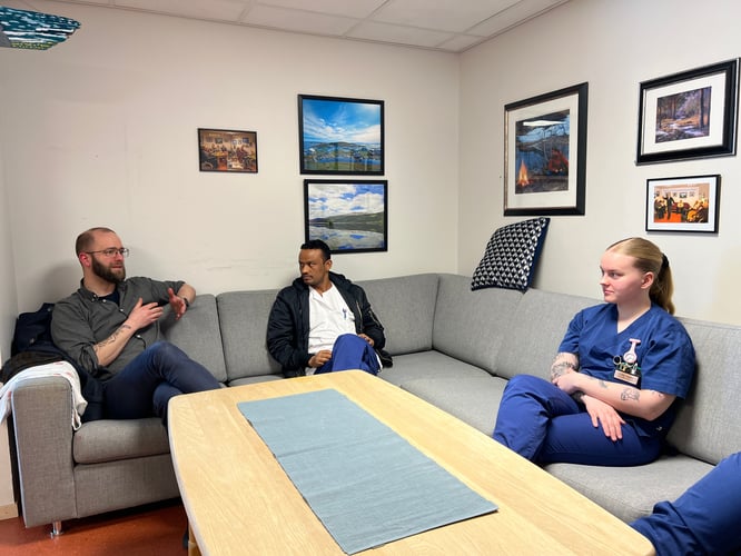 Ved Namsos bo- og velferdssenter har sykepleierstudentene Hassan Derar, Lilly-Sofie Mellingen og Silje S. Wennevik pause i dagens skift. De er andreårsstudenter ved sykepleierutdanninga på Nord universitet i Namsos. Nå er de tre studentene i praksis hos hjemmesykepleien.